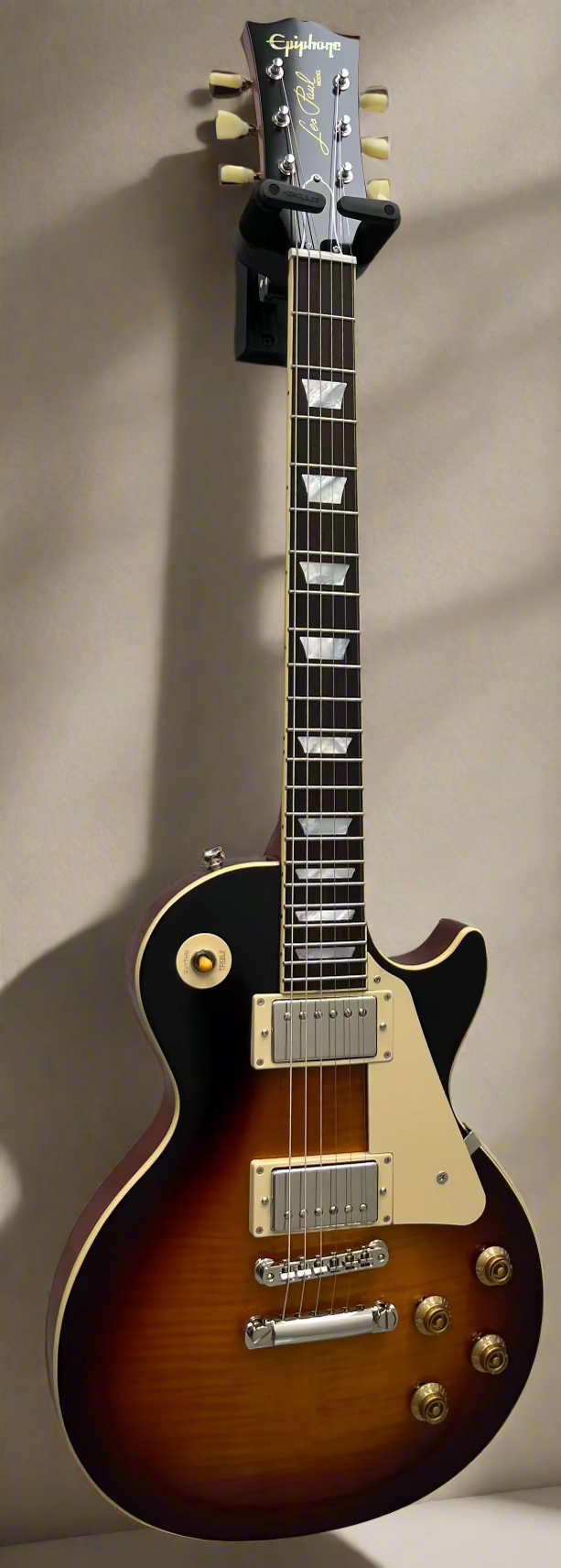 The electronics are first class, with two USA Gibson Custombucker humbucking pickups with Alnico 3 magnets that are hand-wired to CTS® potentiometers, Bumblebee paper-in-oil capacitors, and a Switchcraft® pickup selector toggle switch and 1/4" output jack. The Vintage Gloss finish gives the guitar a vintage appearance without looking overly aged and is nicely complimented by the nickel hardware, including the Epiphone Deluxe "Single Ring" Keystone button tuners. A brown hardshell case with Inspired by Gibson Custom graphics and a pink plush-lined interior is also included. This is the perfect Les Paul for players who love the vintage appeal of the classic 1959 Les Paul Standard but don't want to mortgage or sell the house to afford one.