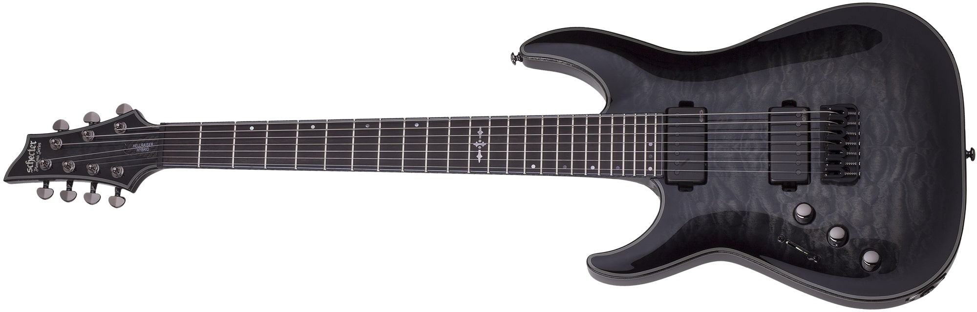 The Hellraiser Hybrid is the long awaited love child of the always popular Hellraiser and SLS lines from Schecter. With its quilted maple top on a mahogany body which has been sculpted with a deeper curve and an increased upper access cutaway the Hellraiser Hybrid C-7 is a beautiful intrument. From the SLS side the main inheritance is the ultra-slim profile neck and compound radius ebony fingerboard for even better playability and access across the fretboard. Designed to take the best of each of the lines and roll them into one guitar the C-7 offerers everything you could want from a metal axe! Loaded with EMG 57-7H and EMG 66-7H pickups in the bridge and neck respectively this guitar produces a more traditional sound than you may be used to from EMG pickups but don't worry these pickups are still made to be loud and pushed through a high gain amplifier with that low 'B' string on this 7 string Goliath leading the charge through your rig of choice. Add in the Hipshot bridge and Schecter locking tuners and you have a guitar that can handle the heaviest of playing styles while remaining in tune.