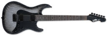 The SN-1000HT Silver Blast is a guitar that offers tone and playability that’s as intense as its looks. Its textured, sandblasted Silver Blast finish over a swamp ash body is joined with bolt-on construction at 25.5” scale to a roasted maple neck. Its Macassar ebony fingerboard offers a compound radius for maximum speed and comfort, and includes 22 extra-jumbo stainless steel frets, mother-of-pearl dot inlays, and is scalloped from frets 17-22. Components on the SN-1000HT Silver Blast include include LTD locking tuners, a black bone nut, a Hipshot hardtail bridge with string-thru-body, and a pair of Fishman Fluence Modern 3-Voice Humbucker pickups (ceramic in the bridge, alnico in the neck), with voice selection via push/pull controls.
