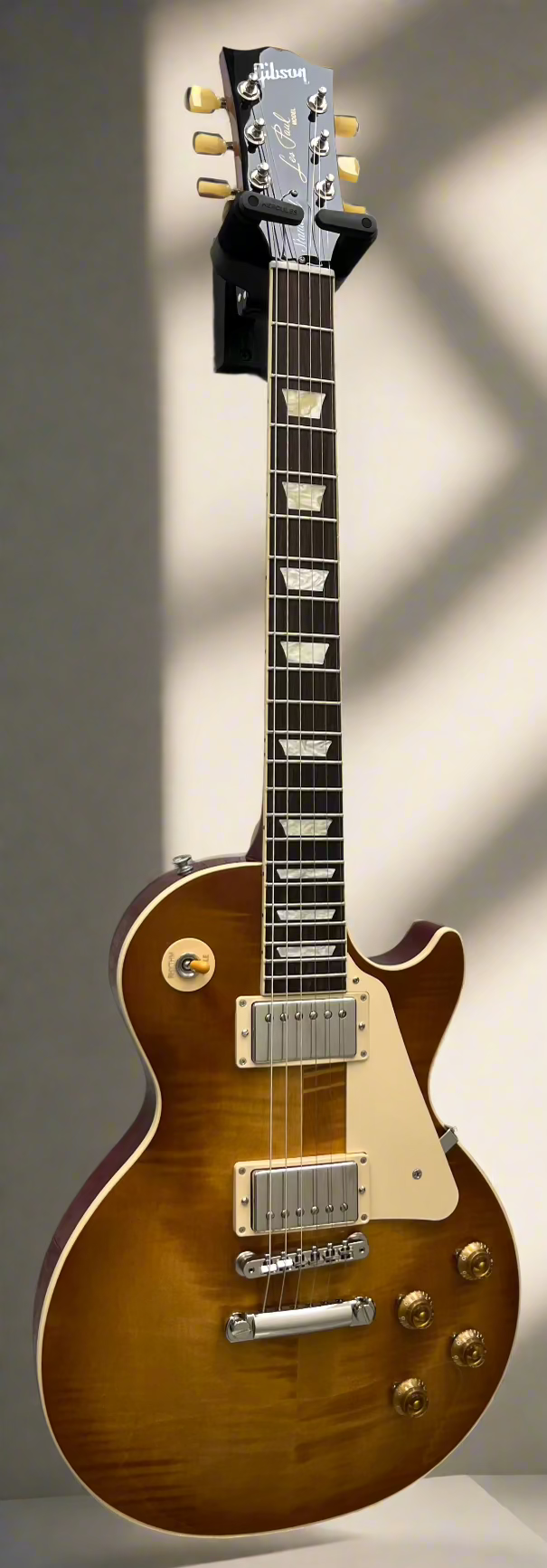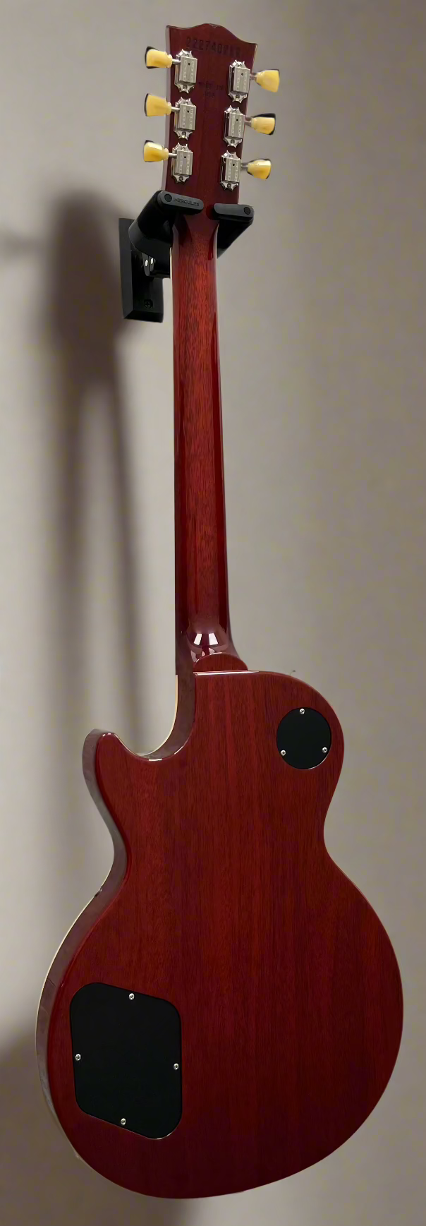 The new Les Paul Standard returns to the classic design that made it relevant, played, and loved shaping sound across generations and genres of music. It pays tribute to Gibson's Golden Era of innovation and brings authenticity back to life. The Les Paul Standard '50s has a solid mahogany body with a maple top and a rounded 50s-style mahogany neck with a rosewood fingerboard and trapezoid inlays. It's equipped with an ABR-1, the classic-style Tune-O-Matic bridge, an aluminum Stop Bar tailpiece, Vintage Deluxe tuners with Keystone buttons, and aged gold Top Hat knobs. The calibrated Burstbucker 1 (neck) and Burstbucker 2 (bridge) pickups are loaded with Alnico 2 magnets and wired with audio taper potentiometers and Orange Drop capacitors.