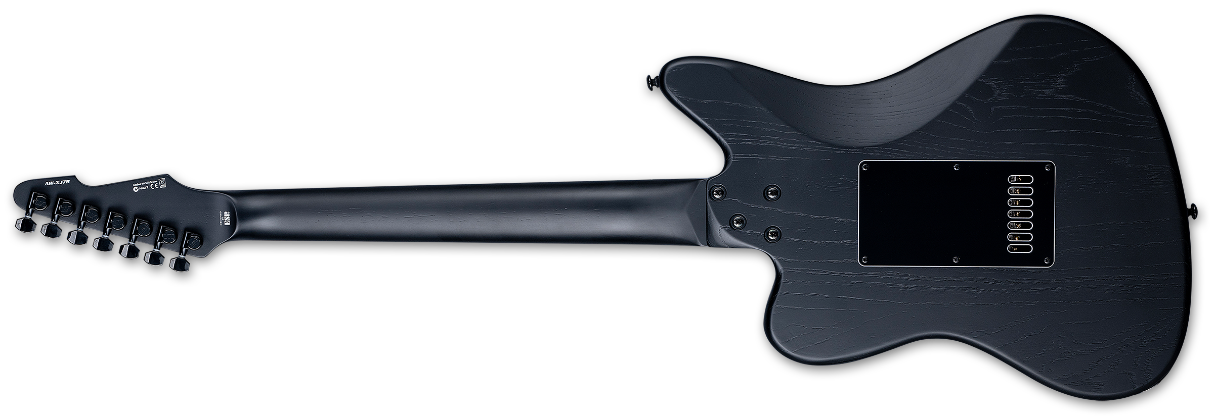 The LTD AW-XJ7 Baritone EverTune in Black Open Grain Satin finish offers a 7-string, 27” scale baritone scale, EverTune bridge, bolt-on construction, a resonant swamp ash body, and a five-piece maple/walnut/padauk neck with a Macassar ebony fingerboard, 24 extra-jumbo stainless steel frets, a brushed black pickguard, LTD locking tuners, and a single DiMarzio D-Activator 7 passive pickup that can be split with a push/pull volume control. Includes ESP hardshell form fit case.