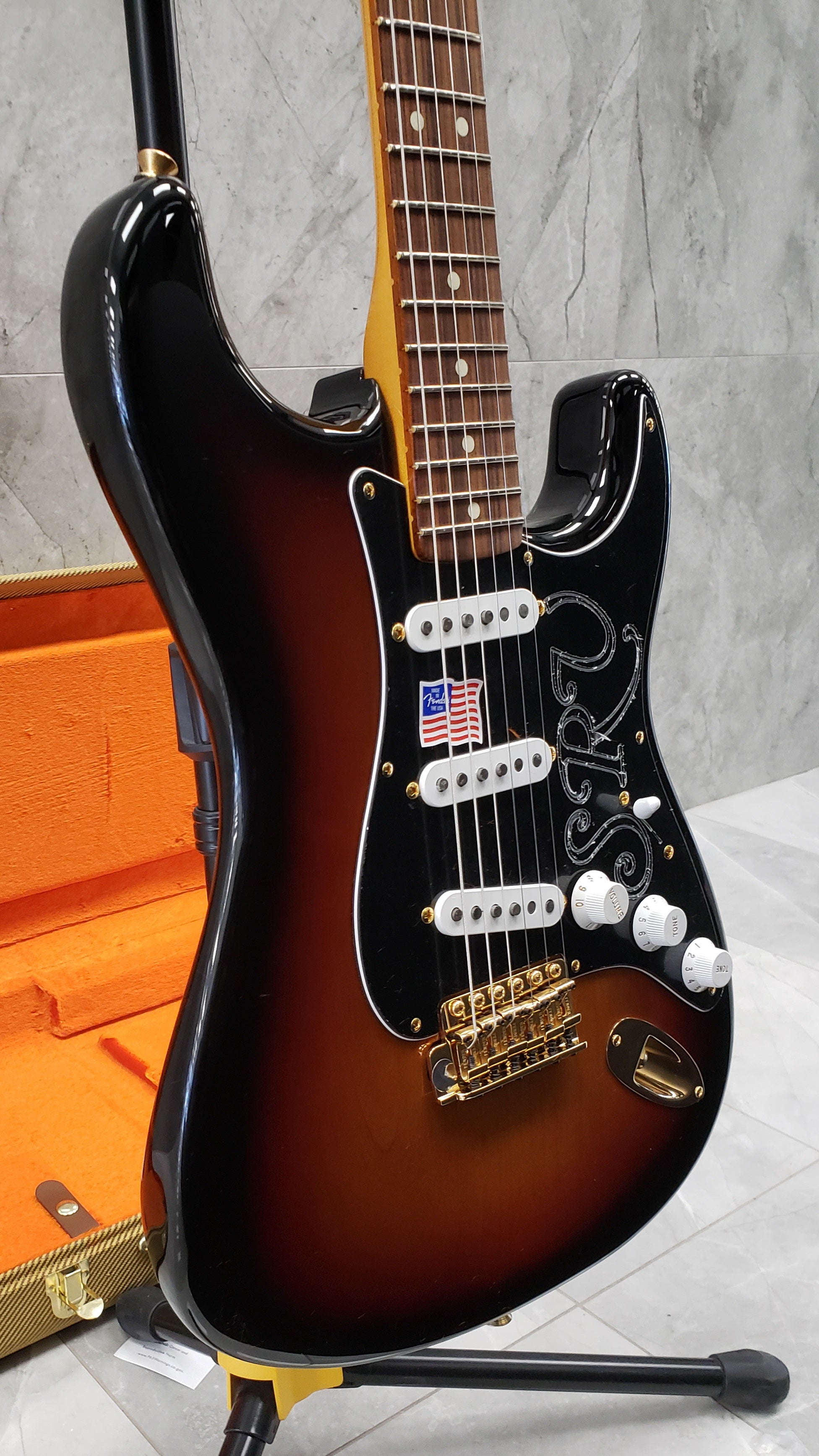 Stevie Ray Vaughan collaborated with Fender to produce a signature Stratocaster® guitar shortly before his untimely passing in 1990. It features an alder body and an early '60s oval neck profile, pau ferro fingerboard with jumbo frets, three Fender Texas Special™ single-coil pickups, gold-plated hardware and a reversed left-hand vintage tremolo unit.